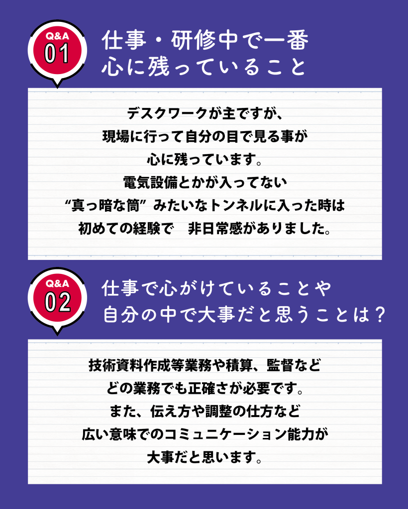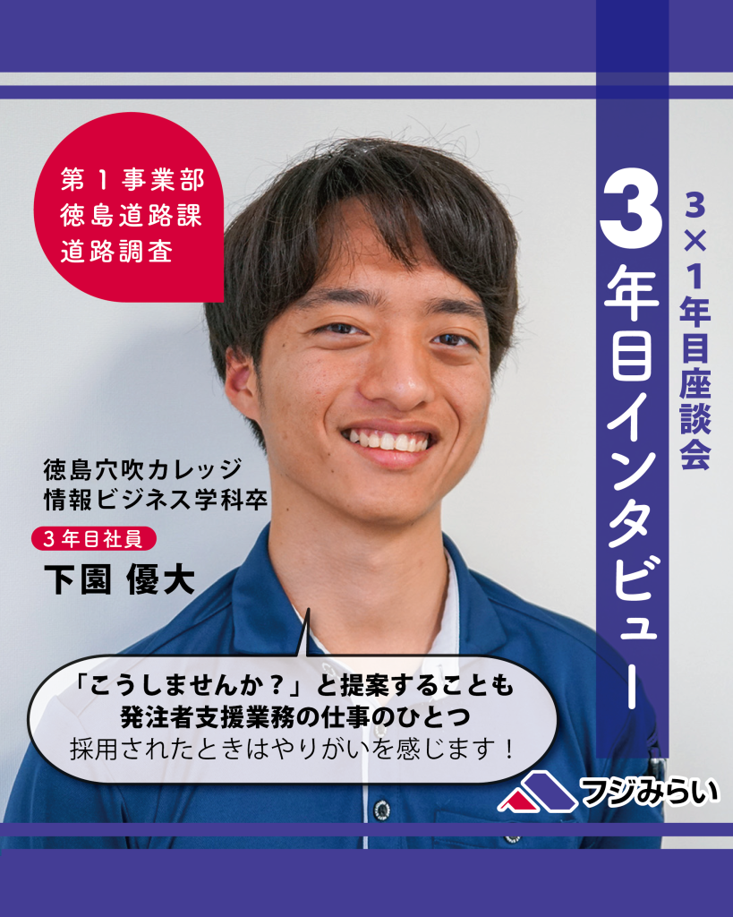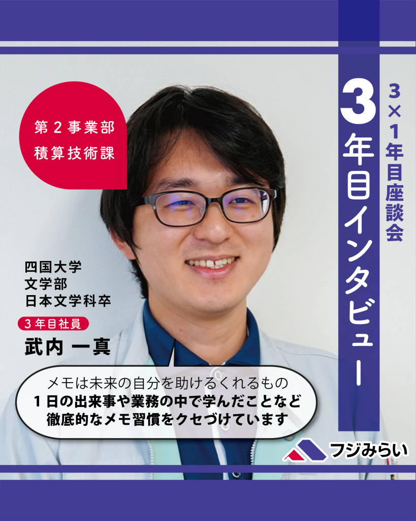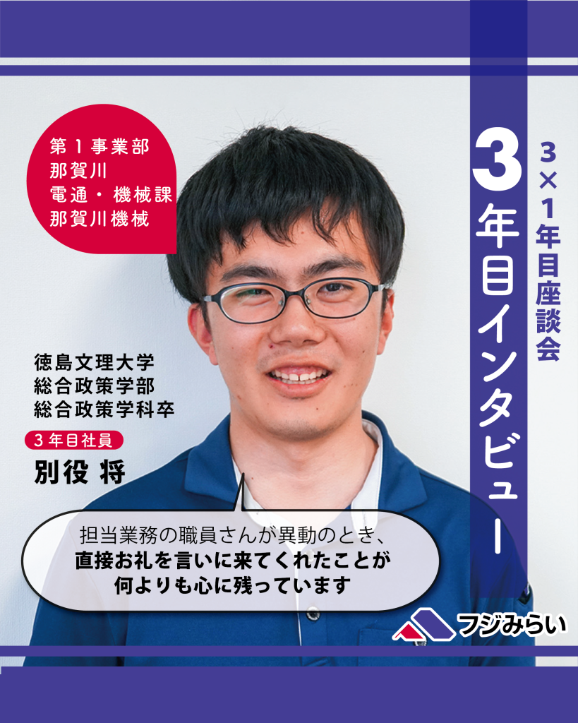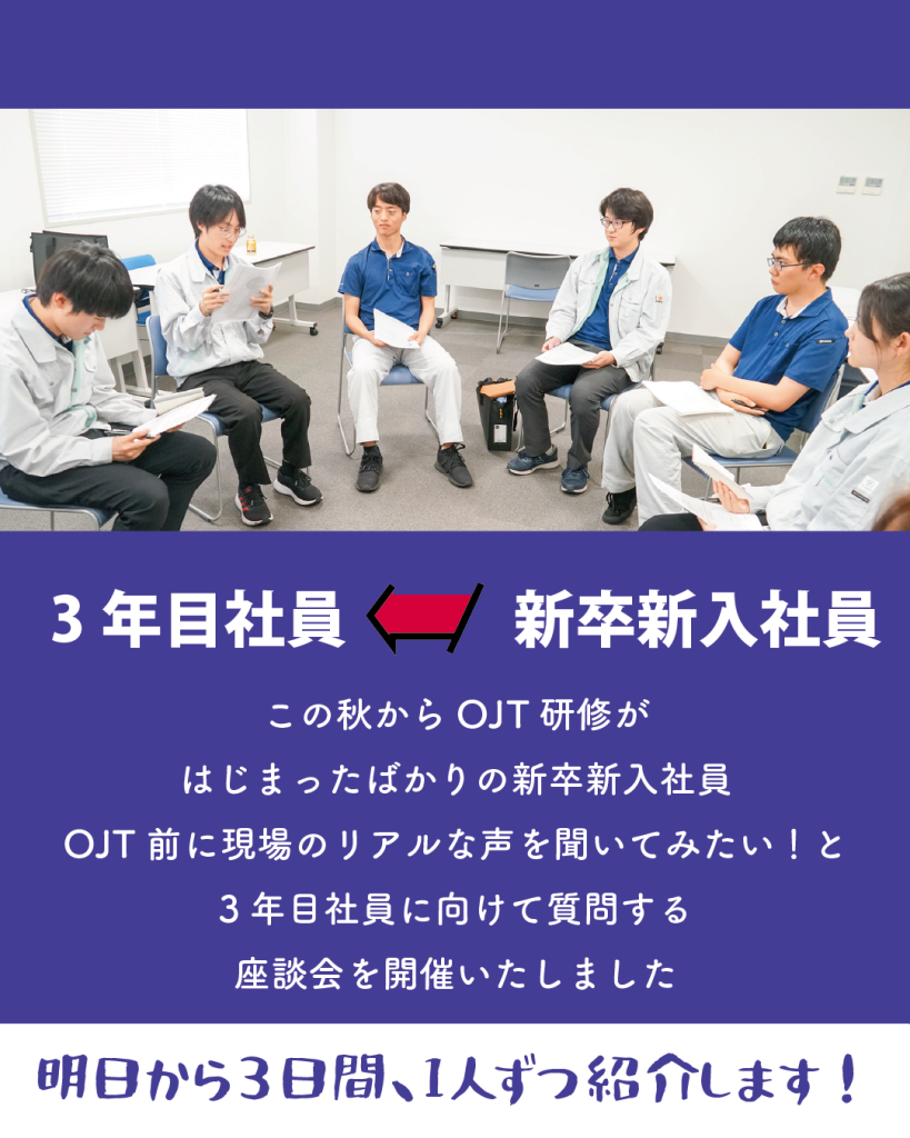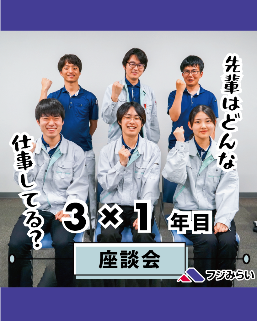 新入社員の皆さんから「研修前に現場のリアルな声を聞きたい!」という声があり、3年目社員との座談会を開催しました。座談会では、新入社員からの質問に3年目社員が答え、アドバイスをインタビュー形式でお届けしました。その内容をフジみらい公式SNSでご紹介しています。