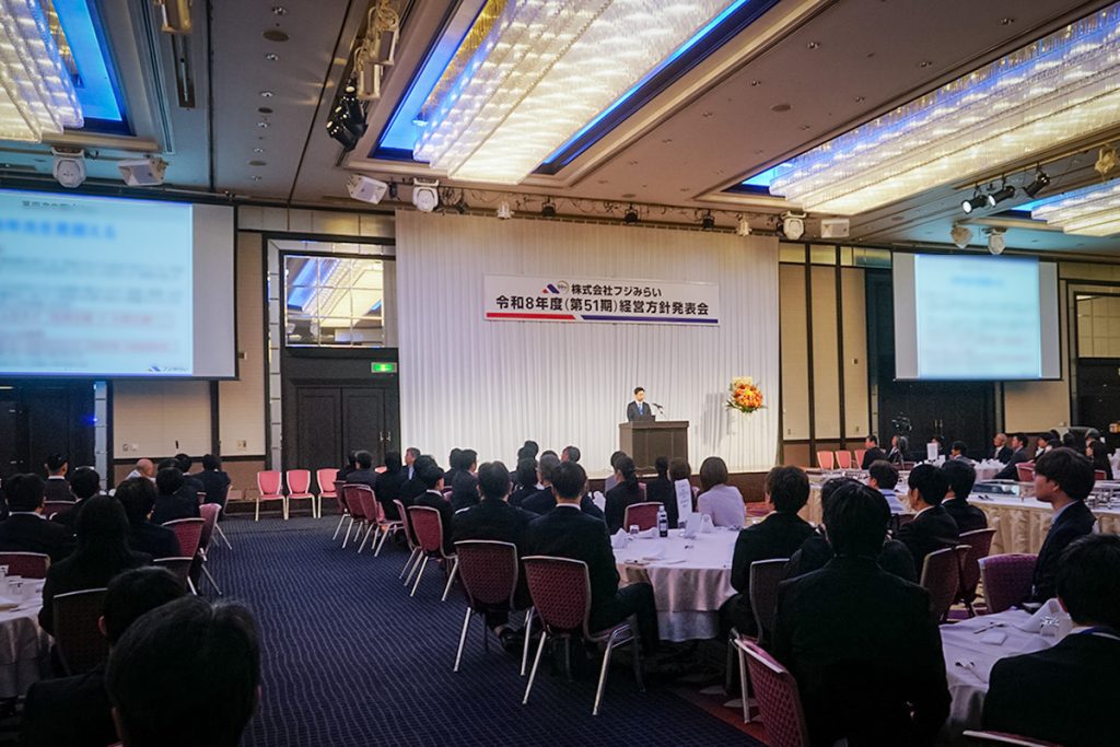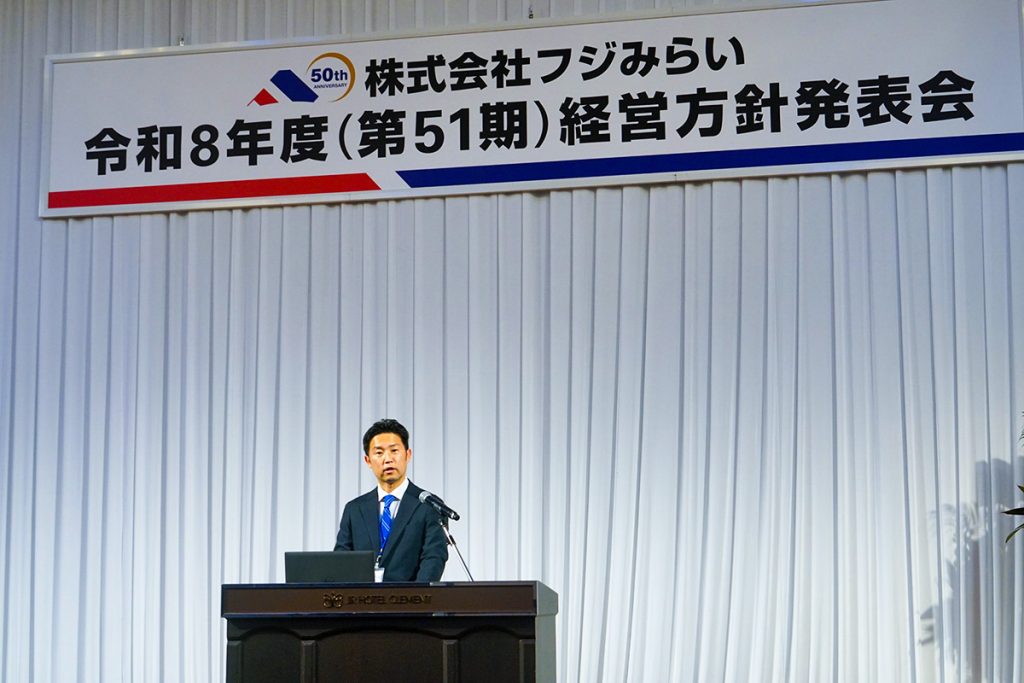 令和8年4月11日、株式会社フジみらいでは令和8年度経営方針発表会を開催しました。普段はそれぞれの現場や部門で業務に取り組む社員が一堂に会し、新年度および中期的な会社の方向性や重点施策について理解を深めることを目的として、毎年実施しています。