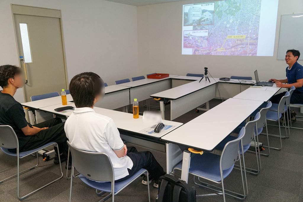 そして9月3日には、当社にて「学外エクスターンシップ」を実施し、2名の学生さんをお迎えしました。社長からは事業内容や経営方針、当社の強みなどを、那賀川河川課の部門長からは、学生さんたちには聞き馴染みのない「発注者支援業務」とは何かを説明いたしました。新卒1~2年目の先輩社員も交えての座談会も行いました。