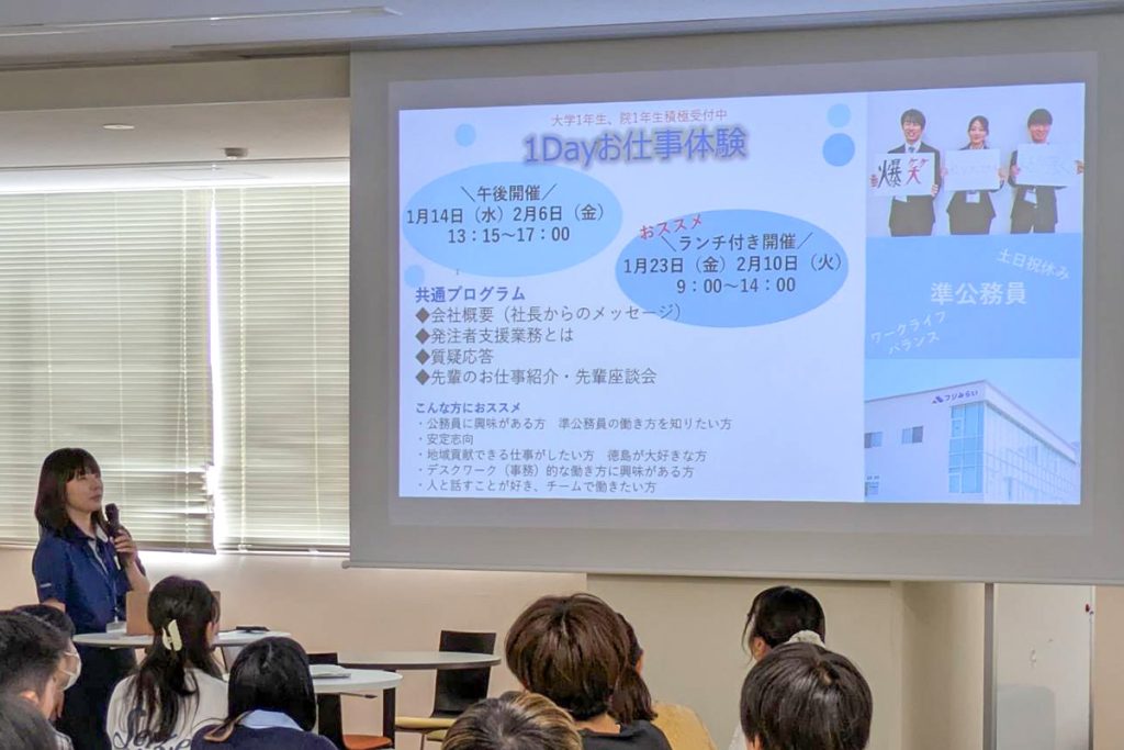 徳島大学では、将来徳島県内で働きたいと考えている学生を対象に、地域の業界・業種についての理解を深め、地域企業と大学のつながりを築くことを目的とした授業の一環として、毎年「エクスターンシップ」を開催しています。
