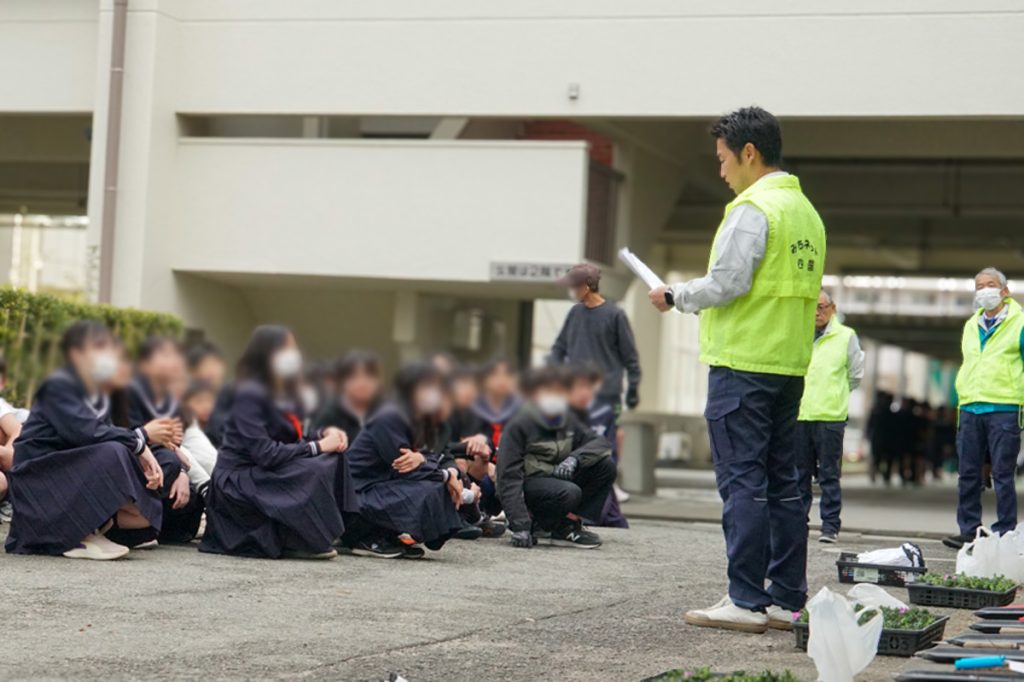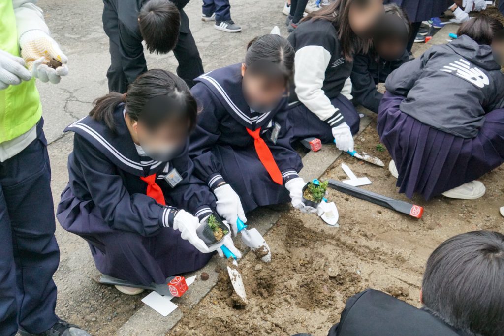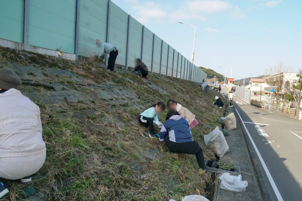 また、3月1日には、八万南小学校PTAの皆さまにも多数ご参加いただき、八万南小学校南側の園瀬川堤防に芝桜約700株の植え付けを行いました。