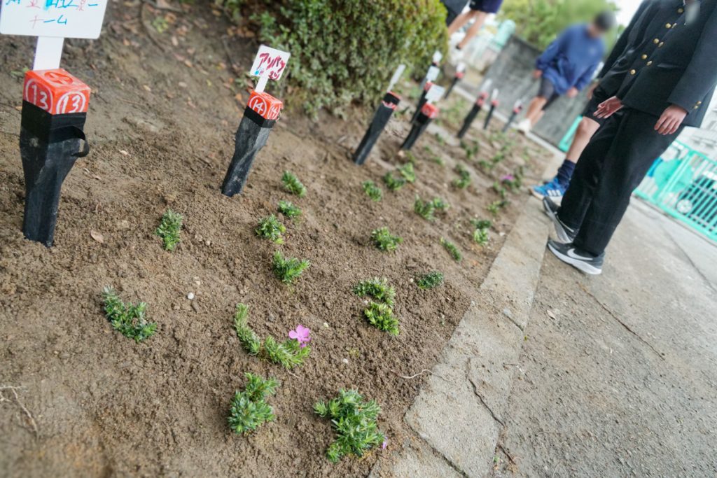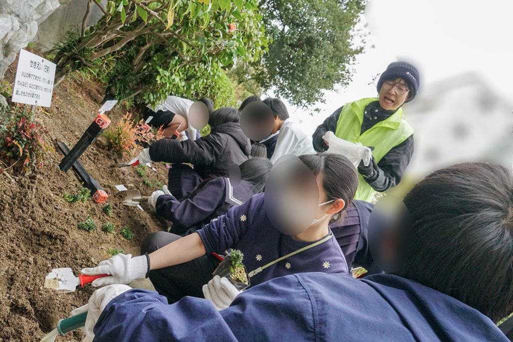 植え付けに先立ち、芝桜の植え方や注意点について説明を行い、その後、子どもたちはクラスメイトと協力しながら、楽しそうに作業に取り組んでいました。